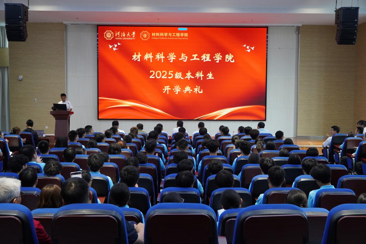 2025年9月8日上午,河海大学材料科学与工程学院2025级本科生开学典礼在江宁校区隆重举行。学院党委书记陈伟刚,院长赵永好,副院长宋丹,教授代表、本科新生班导师和2025级本科生辅导员、2025级全体本科新生以及新生家长参加了此次典礼。典礼由学院党委副书记、副院长辛绍权主持。