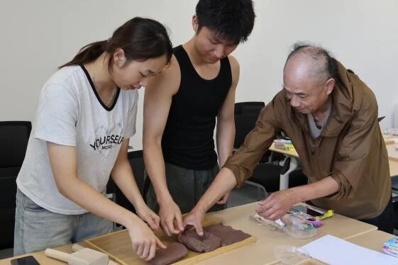 随后,国家级非遗传承人朱敬微老师以梅之傲骨、兰之清幽、竹之劲节、菊之淡泊、莲之高洁——这五种象征高尚品格与廉洁精神的花卉为主题,展开了一场生动的技艺教学。他悉心示范,从揉泥塑形到精雕细琢,手把手指导同学们进行创作。在朱老师的点拨下,同学们全情投入,指尖翻飞间,一团团朴实的泥土被赋予了新的生命,化作一件件形态生动、寓意深远的廉洁主题泥塑作品。