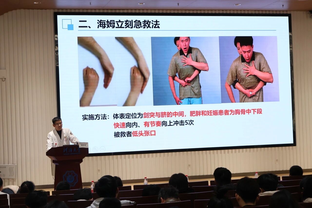 培训伊始,袁月林医生登上讲台,凭借其深厚的专业素养,为师生们带来了一场干货满满的知识盛宴。袁医生从专业的角度以及丰富的经验出发,介绍了校园急救培训的重要性以及各类校园急救情况和对应处理方法,借助图文并茂的 PPT,详细讲解了心肺复苏(CPR)、海姆立克急救法等常见急救技术的原理与适用场景,介绍AED(自动体外除颤器)设备的功能和适用场景,吸引了线上线下师生的注意,不断拓展自身急救知识。