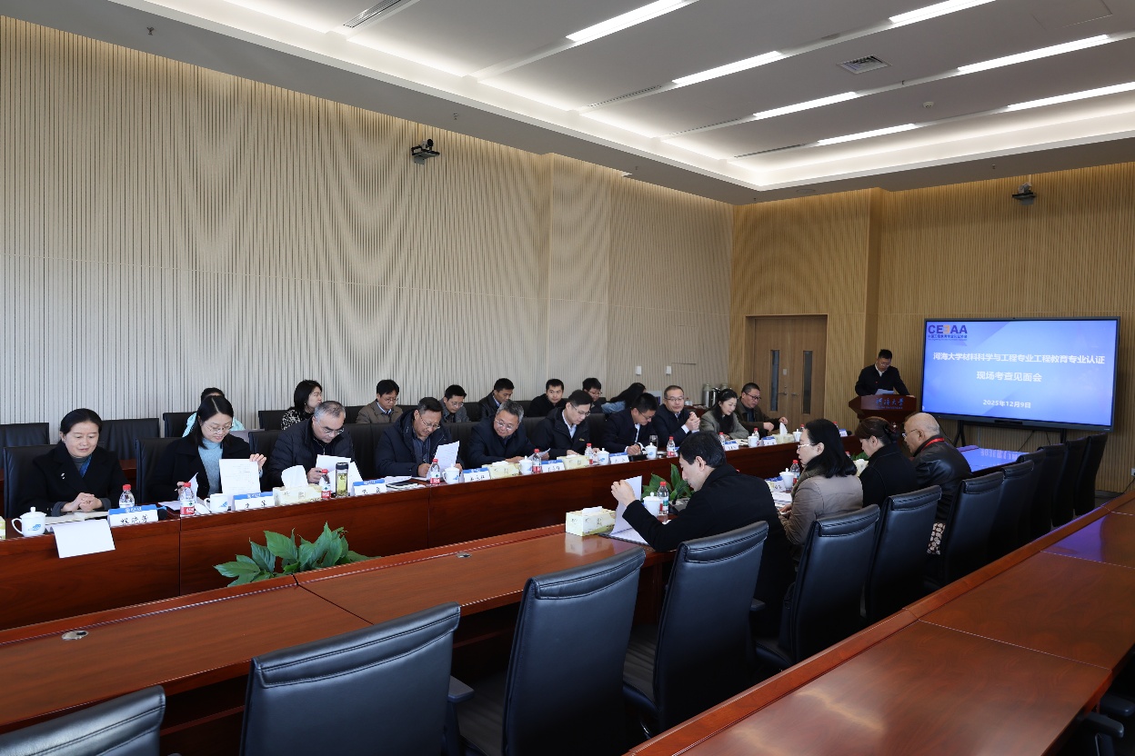 见面会上,沈扬副校长对各位专家的到来表示热烈欢迎。他介绍,河海大学作为以水利为特色的教育部直属全国重点大学,正全力推进“世界一流特色研究型大学”建设,学校高度重视工程教育专业认证,近年来已出台10余个校级认证机制文件,加强认证过程化管理,通过研发OBE智慧教务系统、升级AI课堂教学分析系统、创设“三位一体”学生评教系统等,构建全流程、精细化的质量监测体系。专家组组长宋晓岚教授介绍了此次认证的任务、目的及考查要求流程。材料科学与工程专业负责人赵永好教授汇报了专业建设历程,并补充说明认证自评报告内容。在质询环节,专家组成员结合自评报告审读情况,围绕培养方案修订、教师教学质量评价、第二课堂建设、招生与就业等方面,与学校相关职能部门和学院负责人进行了深入交流。